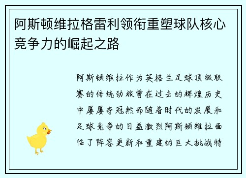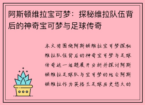 文章摘要:近年来,阿斯顿维拉足球俱乐部的崛起可谓一场惊艳的土豪逆袭。曾经的中游球队,在短短几年内凭借强大的资金支持,迅速跻身英超顶级竞争行列,背后的资金来源与未来计划成了球迷和媒体热议的话题。本文将从四个方面详细探讨阿斯顿维拉崛起的幕后故事。首先,我们将分析阿斯顿维拉的资金来源,重点揭示其背后的投资...